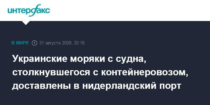 Киев. 31 августа. INTERFAX.RU - Граждане Украины - члены экипажа контейнеровоза MSC Nikita, столкнувшегося с другим судном у берегов Нидерландов, доставлены в порт Хук ван Холланд.