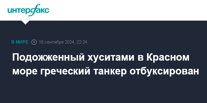 Москва. 16 сентября. INTERFAX.RU - Атакованный в августе йеменскими хуситами греческий танкер Sounion был успешно отбуксирован в безопасное место без какого-либо разлива нефти, сообщила в понедельник французская Le Figaro.