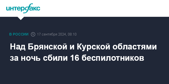 Над Брянской и Курской областями за ночь сбили 16 беспилотников