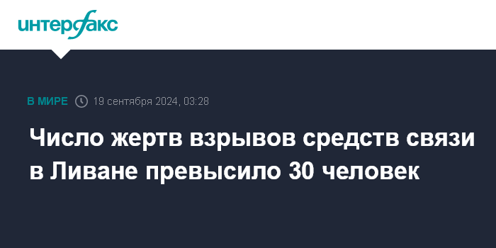 Москва. 19 сентября. INTERFAX.RU - Министерство здравоохранения Ливана сообщило, что число погибших в результате взрывов средств связи в среду составило 20 человек, во вторник, по данным СМИ, жертвами взрывов пейджеров стали 12 человек.