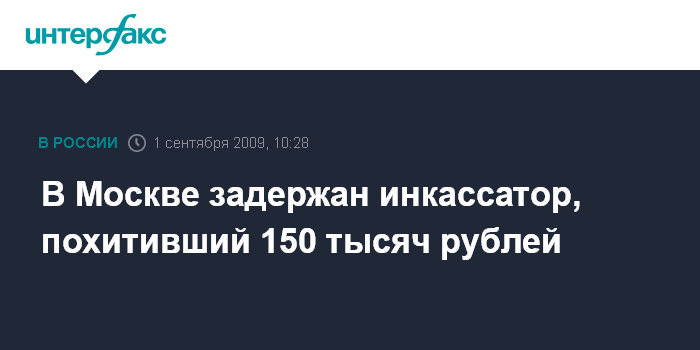 Москва. 1 сентября. INTERFAX.RU - В Москве задержан инкассатор, который похитил 150 тыс. рублей, принадлежавших крупному коммерческому банку, сообщил "Интерфаксу" источник в правоохранительных органах города во вторник.