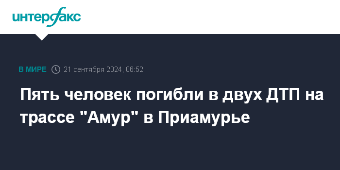 Москва. 21 сентября. INTERFAX.RU - Две аварии на федеральной автодороге "Амур" в Амурской области унесли жизни пятерых человек, включая ребенка, двое госпитализированы, сообщает региональное управление ГИБДД.