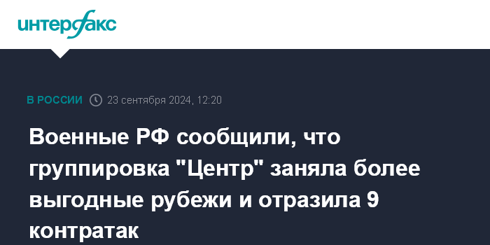 Москва. 23 сентября. INTERFAX.RU - Войска группировки "Центр" за сутки заняли более выгодные рубежи и отразили девять контратак украинских войск, сообщило министерство обороны РФ в понедельник.