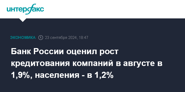 Банк России оценил рост кредитования компаний в августе в 1,9%, населения - в 1,2%