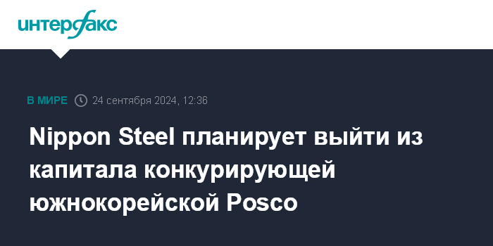Москва. 24 сентября. INTERFAX.RU - Японская сталелитейная Nippon Steel планирует продать все имеющиеся у нее 2,89 млн акций, или 3,5%, конкурирующей южнокорейской Posco, говорится в сообщении Nippon.