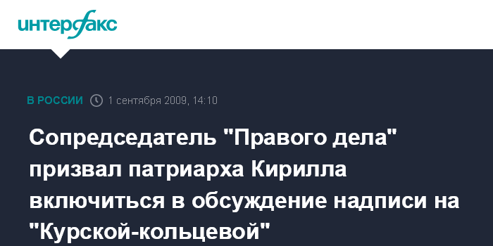 Сопредседатель "Правого дела" призвал патриарха Кирилла включиться в обсуждение надписи на "Курской-кольцевой"