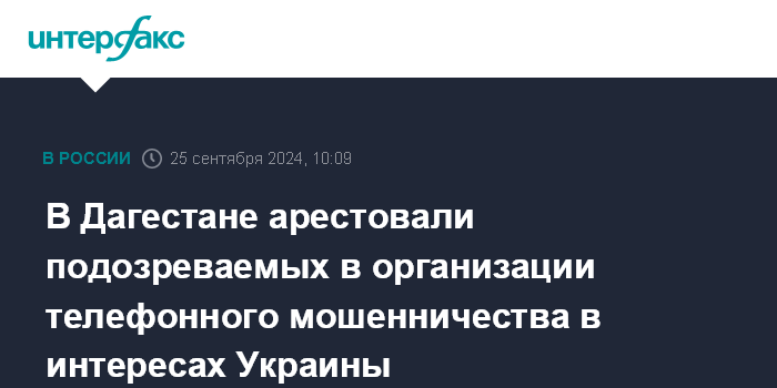 Москва. 25 сентября. INTERFAX.RU - Пятеро членов группы, причастной к организации массовых мошеннических звонков от имени якобы правоохранительных органов, задержаны и отправлены под стражу в Дагестане, они действовали в интересах Украины, сообщает Центр общественных связей (ЦОС) ФСБ в среду.