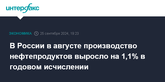 Москва. 25 сентября. INTERFAX.RU - В России в августе производство кокса и нефтепродуктов выросло на 1,1% в годовом измерении, сообщает Росстат. Прирост к июлю 2024 года составил 2,3%.