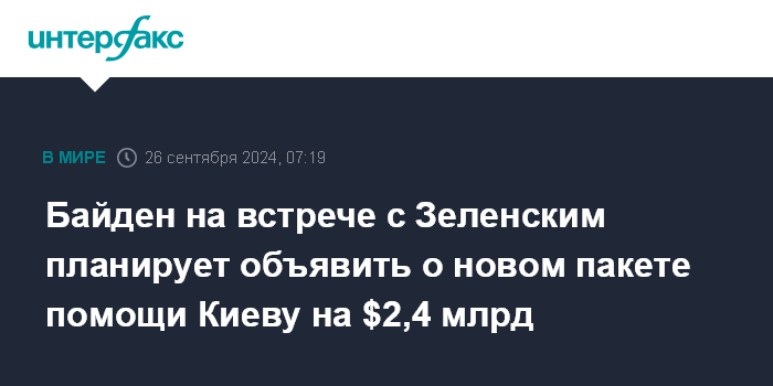 Москва. 26 сентября. INTERFAX.RU - Президент США Джо Байден на запланированной встрече с Владимиром Зеленским в Белом доме может объявить о новом пакете военной помощи Украине на $2,4 млрд, сообщила газета Politico.