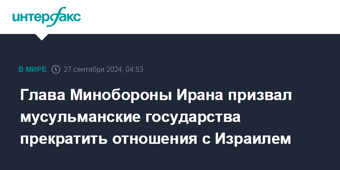 Москва. 27 сентября. INTERFAX.RU - Министр обороны Ирана Азиз Насирзаде считает, что в качестве инструмента давления на Израиль мусульманским странам следует разорвать политические и экономические отношения с Израилем.