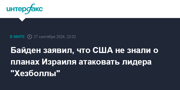 Москва. 27 сентября. INTERFAX.RU - Президент США Джо Байден заявил в пятницу, что Вашингтону не было известно о намерении Израиля нанести удар по лидеру движения "Хезболла" Хасану Насралле.