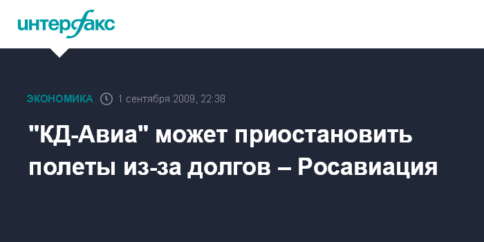 "1 сентября 2009 года в Федеральное агентство воздушного транспорта поступила телеграмма от авиакомпании "КД Авиа", в которой сообщается, что эксплуатант может прекратить свою операционную деятельность в связи с задолженностями перед лизингодателями, топливозаправочными фирмами, службами аэронавигации и аэропортами России и Европы", - говорится в сообщении Росавиации.