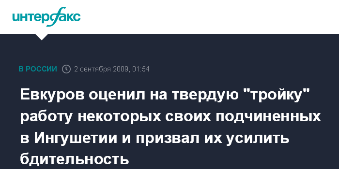 Москва. 2 сентября. ИНТЕРФАКС - Президент Ингушетии Юнус-Бек Евкуров, проведя проверки среди своих подчиненных, не смог оценить уровень их работы на "отлично".