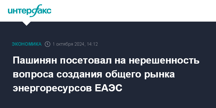 Москва. 1 октября. INTERFAX.RU - Премьер-министр Армении Никол Пашинян заявил о замедлении темпов роста экономик стран ЕАЭС из-за нерешенного вопроса общего рынка энергоресурсов. Он высказал это мнение на заседании Евразийского межправительственного совета в Ереване
