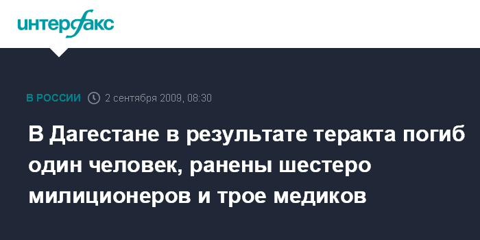 "В 4:50 утра в Кировском районе Махачкалы на федеральной трассе "Кавказ" около поста ДПС неизвестный при попытке досмотра его автомобиля "Жигули" привел в действие самодельную бомбу мощностью 40 кг тротила. Шестеро милиционеров и трое медиков, дежурившие на посту, получили ранения. Один местный житель также получил осколочные ранения и скончался на месте", - сообщил источник в правоохранительных органах Дагестана.
