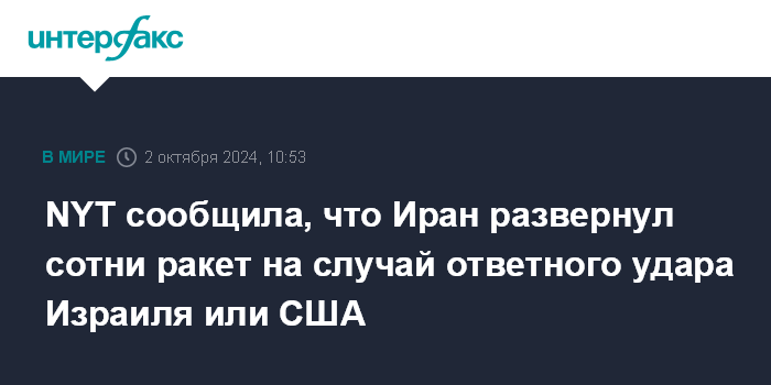 Москва. 2 октября. INTERFAX.RU - Иранские военные подготовили к запуску еще сотни ракет на случай, если Израиль или США нанесут удар в ответ на иранский ракетный обстрел Израиля. Об этом сообщает The New York Times со ссылкой на неназванных членов Корпуса стражей Исламской революции (КСИР).