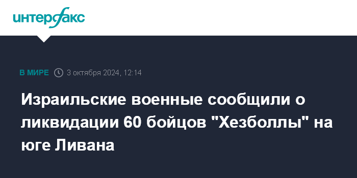 Москва. 3 октября. INTERFAX.RU - Армии обороны Израиля (ЦАХАЛ) за сутки удалось уничтожить 60 бойцов движения "Хезболла" в боях на юге Ливана, сообщает в четверг The Times of Israel.