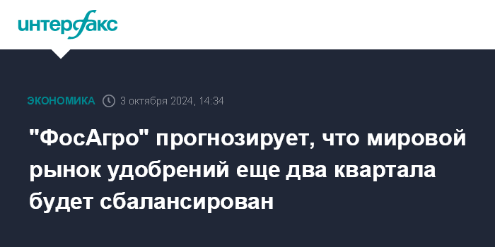 "ФосАгро" прогнозирует, что мировой рынок удобрений еще два квартала будет сбалансирован