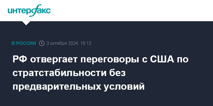 Москва. 3 октября. INTERFAX.RU - Россия категорически отвергает идею о переговорах с США по стратегической стабильности без предварительных условий, заявил в четверг замглавы МИД РФ Сергей Рябков.