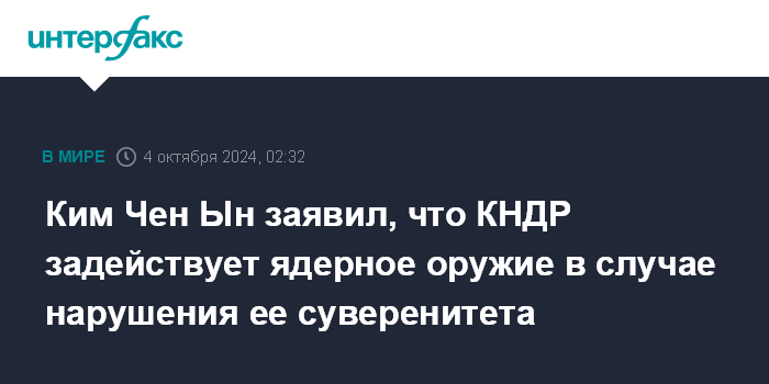 Москва. 4 октября. INTERFAX.RU - Лидер КНДР Ким Чен Ын заверил, что Пхеньян "без колебания" задействует все виды наступательных вооружений, если Южная Корея и США попытаются применить вооруженные силы для нарушения суверенитета Севера, передает Центральное телеграфное агентство Кореи (ЦТАК).