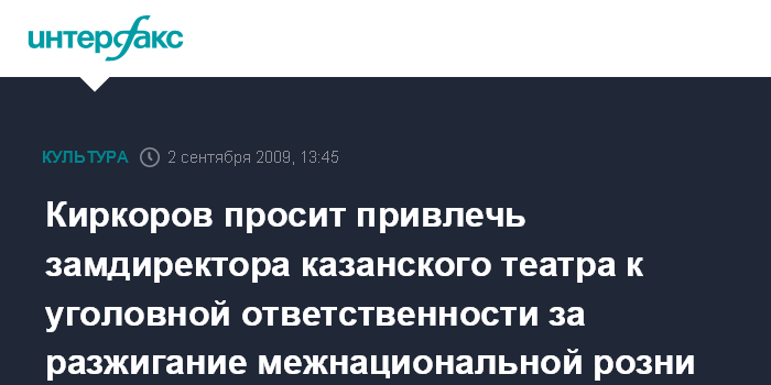 Казань. 2 сентября. INTERFAX.RU - В прокуратуру Вахитовского района Казани (Татарстан) поступило заявление от певца Филиппа Киркорова, в котором просит привлечь к уголовной ответственности за разжигание межнациональной розни заместителя директора по организации зрителей Татарского государственного академического театра оперы и балета (ТГАТОиБ) имени Мусы Джалиля Юрия Ларионова.