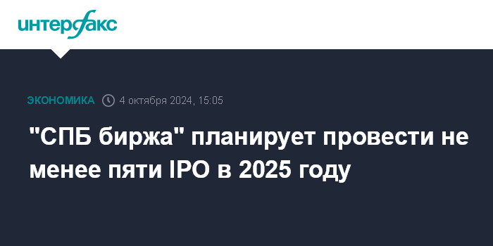 Москва. 4 октября. INTERFAX.RU - "СПБ биржа" рассчитывает, что в 2025 году не менее пяти эмитентов проведут IPO на площадке.