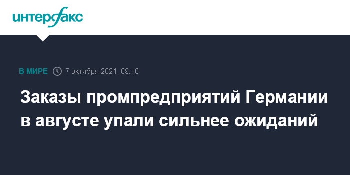 Совокупный объем заказов германских промпредприятий в августе был на 3,9% ниже показателя за тот же месяц 2023 года.