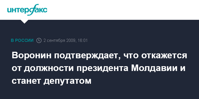 Кишинев. 2 сентября. INTERFAX.RU - Действующий президент Молдавии, председатель Партии коммунистов Владимир Воронин подтвердил, что останется простым депутатом и откажется от исполнения обязанностей президента. Об этом он заявил на совещании общепартийного форума Партии коммунистов, которое состоялось в среду.