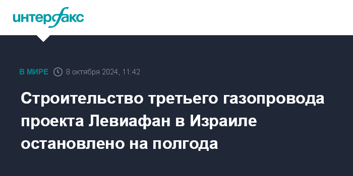 Москва. 8 октября. INTERFAX.RU - Chevron Mediterranean Limited – оператор морского газового проекта Левиафан (Leviathan) у берегов Израиля – в связи с усилением мер безопасности в регионе на фоне эскалации боевых действий решила приостановить работы по прокладке подводного трубопровода в рамках третьего этапа развития до апреля 2025 года.