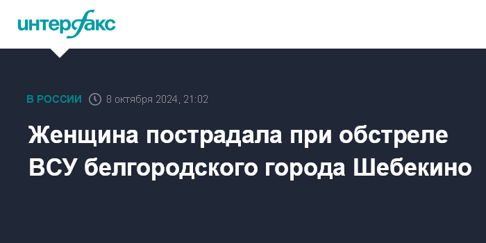 Москва. 8 октября. INTERFAX.RU - Женщина получила ранение при обстреле ВСУ города Шебекино Белгородской области, сообщил во вторник губернатор региона Вячеслав Гладков.