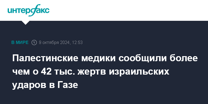 Москва. 9 октября. INTERFAX.RU - В результате израильских атак по сектору Газа погибли около 42 тыс. человек, более 97,7 тыс. пострадали, сообщает в среду "Аль-Джазира" со ссылкой на данные палестинских медиков.