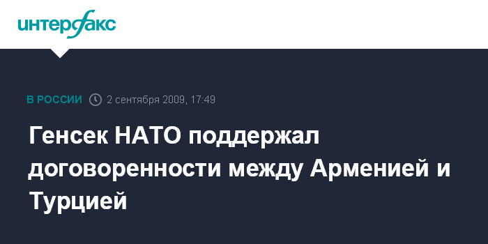 Брюссель. 2 сентября. INTERFAX.RU - Генеральный секретарь НАТО Андерс Фог Расмуссен во вторник приветствовал достижение соглашений о путях нормализации отношений между Арменией и Турцией.
