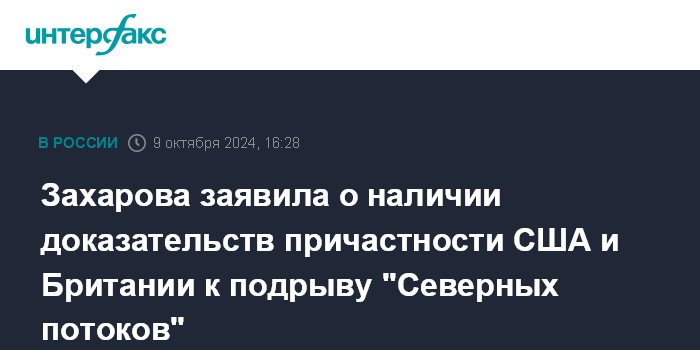 Москва. 9 октября. INTERFAX.RU - Россия располагает доказательствами причастности США и Великобритании к подрыву газопроводов "Северный поток", публиковать эти материалы будет исходя из принципа целесообразности, заявила официальный представитель МИД РФ Мария Захарова.