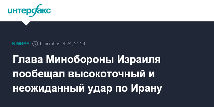 Москва. 9 октября. INTERFAX.RU - Глава израильского Минобороны Йоав Галант в среду заявил, что ответный удар Израиля по Ирану окажется крайне внезапным для Тегерана.