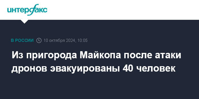 Москва. 10 октября. INTERFAX.RU - Несколько десятков человек вывезли из поселка Родниковый под Майкопом из-за атаки украинских беспилотников минувшей ночью, сообщили "Интерфаксу" в правительстве Адыгеи.