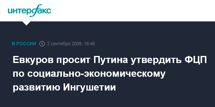Москва. 2 сентября. INTERFAX.RU - Глава Ингушетии Юнус-Бек Евкуров обратился к премьер-министру РФ Владимиру Путину с просьбой утвердить федеральную целевую программу (ФЦП) по социально-экономическому развитию Ингушетии в ближайшие две недели.