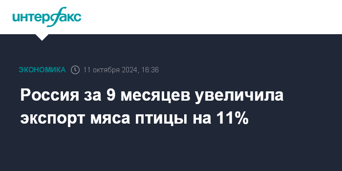 Москва. 11 октября. INTERFAX.RU - Россия за 9 месяцев 2024 года экспортировала 264,2 тысячи тонн мяса птицы и субпродуктов, что на 11% больше, чем за аналогичный период 2023 года, сказано в презентации Россельхознадзора, представленной на выставке "Золотая осень-2024".