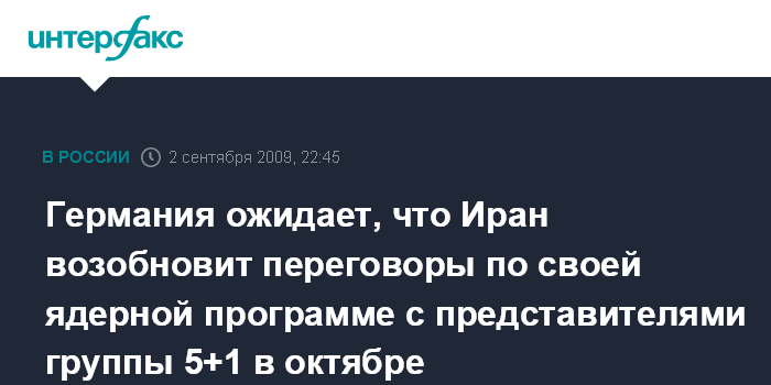 Берлин. 2 сентября. ИНТЕРФАКС - Власти Германии рассчитывают на то, что Иран возобновит в следующем месяце переговоры с представителями группы 5+1 (Великобритания, Китай, Россия, США, Франция, Германия) по национальной ядерной программе.