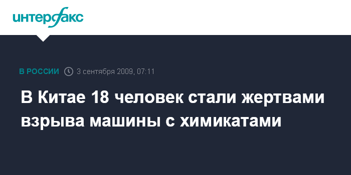 Пекин. 3 сентября. ИНТЕРФАКС-КИТАЙ - Автомобиль, перевозивший химикаты, взорвался в городе Линьи восточной китайкой провинции Шаньдун, в результате происшествия погибли 18 человек, еще 10 человек получили ранения, сообщили в ночь на четверг местные СМИ.