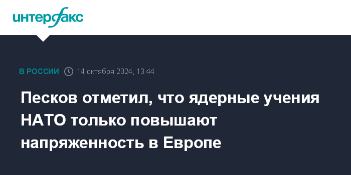 Москва. 14 октября. INTERFAX.RU - В Кремле считают, что крупномасштабные ядерные учения НАТО в Европе только повышают напряженность на фоне украинского конфликта.