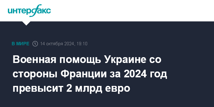 Москва. 14 октября. INTERFAX.RU - Общий объем военной помощи Франции украинской стороне за 2024 год превысит 2 млрд евро, сообщил в понедельник французский министр обороны Себастьян Лекорню.