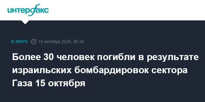 Москва. 15 октября. INTERFAX.RU - Жертвами ударов Израиля по сектору Газа во вторник утром стали более 30 человек, сообщает телеканал Al Mayadeen.
