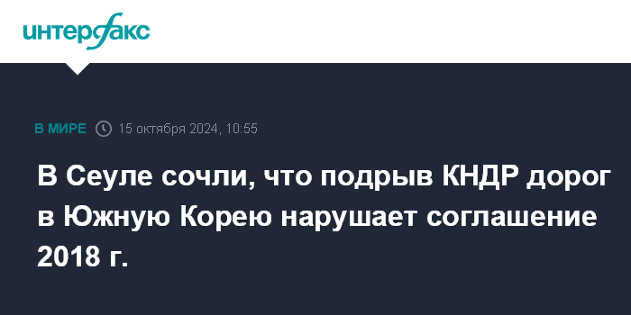 Москва. 15 октября. INTERFAX.RU - Подрыв КНДР участков дорог, ведущих в Южную Корею, идет вразрез с межкорейским соглашением 2018 года, которое предусматривает объединение автомобильных и железных дорог Севера и Юга в одну транспортную систему, заявили во вторник в южнокорейском министерстве по делам объединения.
