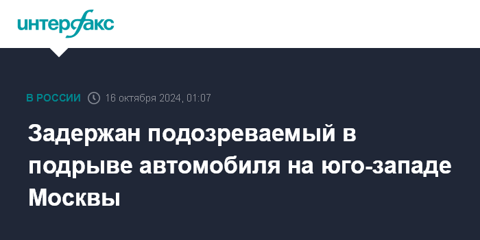Москва. 16 октября. INTERFAX.RU - Столичные правоохранители задержали подозреваемого в подрыве автомобиля на юго-западе Москвы, в результате которого пострадали три человека, сообщила официальный представитель МВД России Ирина Волк.