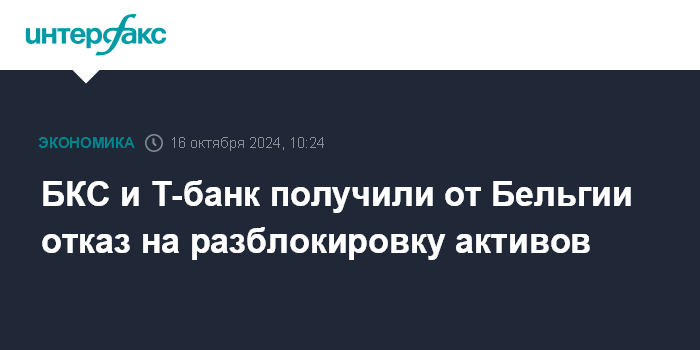 Москва. 16 октября. INTERFAX.RU - "БКС Мир инвестиций" и Т-банк получили от Казначейства Бельгии отказ в разблокировке активов, замороженных в Euroclear.