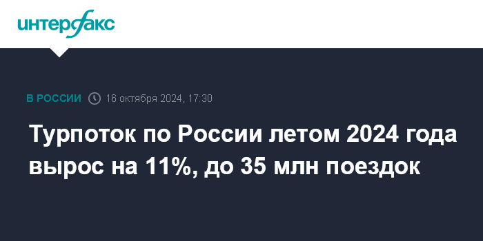 Турпоток по России летом 2024 года вырос на 11%, до 35 млн поездок
