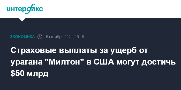 Москва. 16 октября. INTERFAX.RU - Страховые компании могут выплатить от $30 млрд до $50 млрд для возмещения ущерба застрахованной собственности от урагана "Милтон", который обрушился на американский штат Флорида на прошлой неделе, полагает аналитическая компания Verisk.