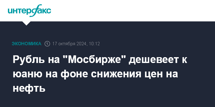 Москва. 17 октября. INTERFAX.RU - Утром в четверг на "Московской бирже" рубль дешевеет к юаню на фоне снижения цен на нефть.