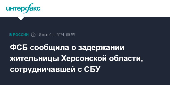 Москва. 18 октября. INTERFAX.RU - ФСБ заявила о задержании в Херсонской области местной жительницы, которая по заданию украинской спецслужбы собирала и передавала информацию о местонахождении пунктов размещения личного состава российских военных.
