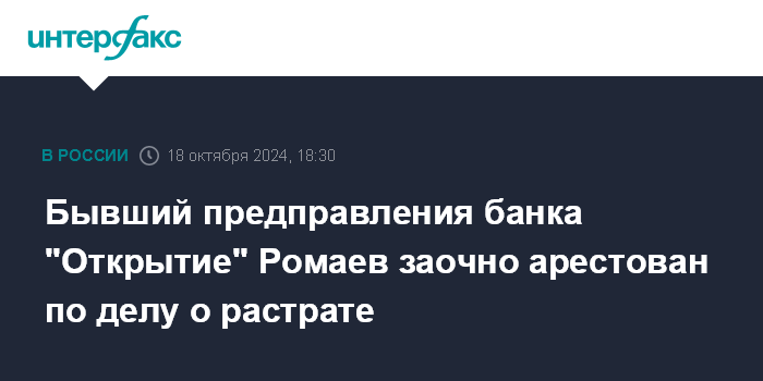 Бывший предправления банка "Открытие" Ромаев заочно арестован по делу о растрате